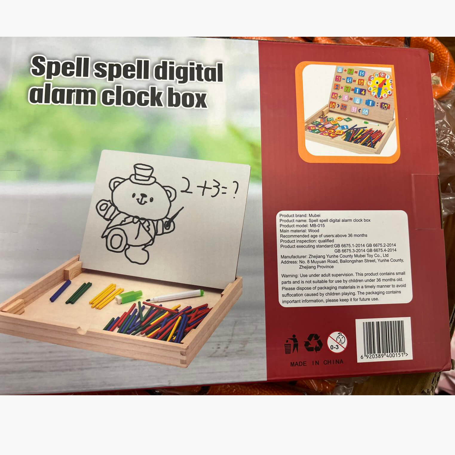 Ova višenamenska drvena kutija kombinuje tablu za pisanje i slaganje brojeva, šareni sat za učenje vremena i raznobojne štapiće za vežbanje matematike i motorike.